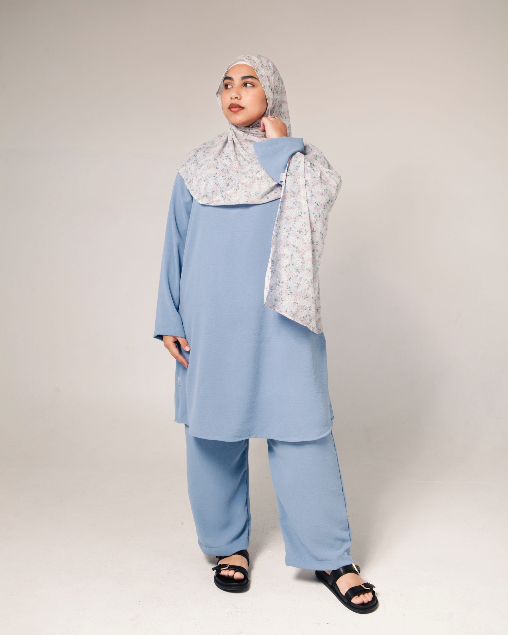 Full length sleeves, side pockets, back 5cm longer with side slits and a crew neckline.