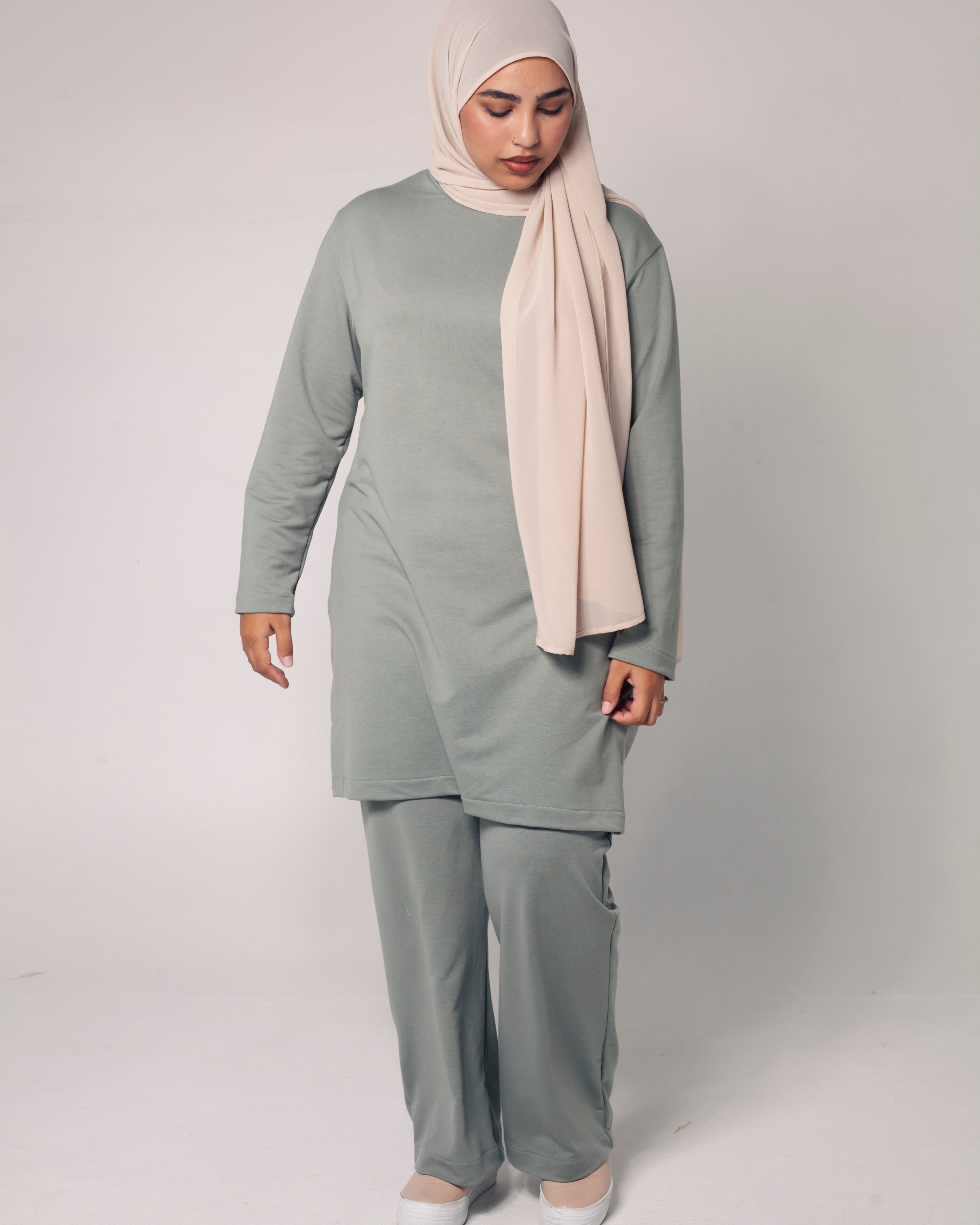 Full length sleeves, side pockets, back 5cm longer with side slits and a crew neckline.