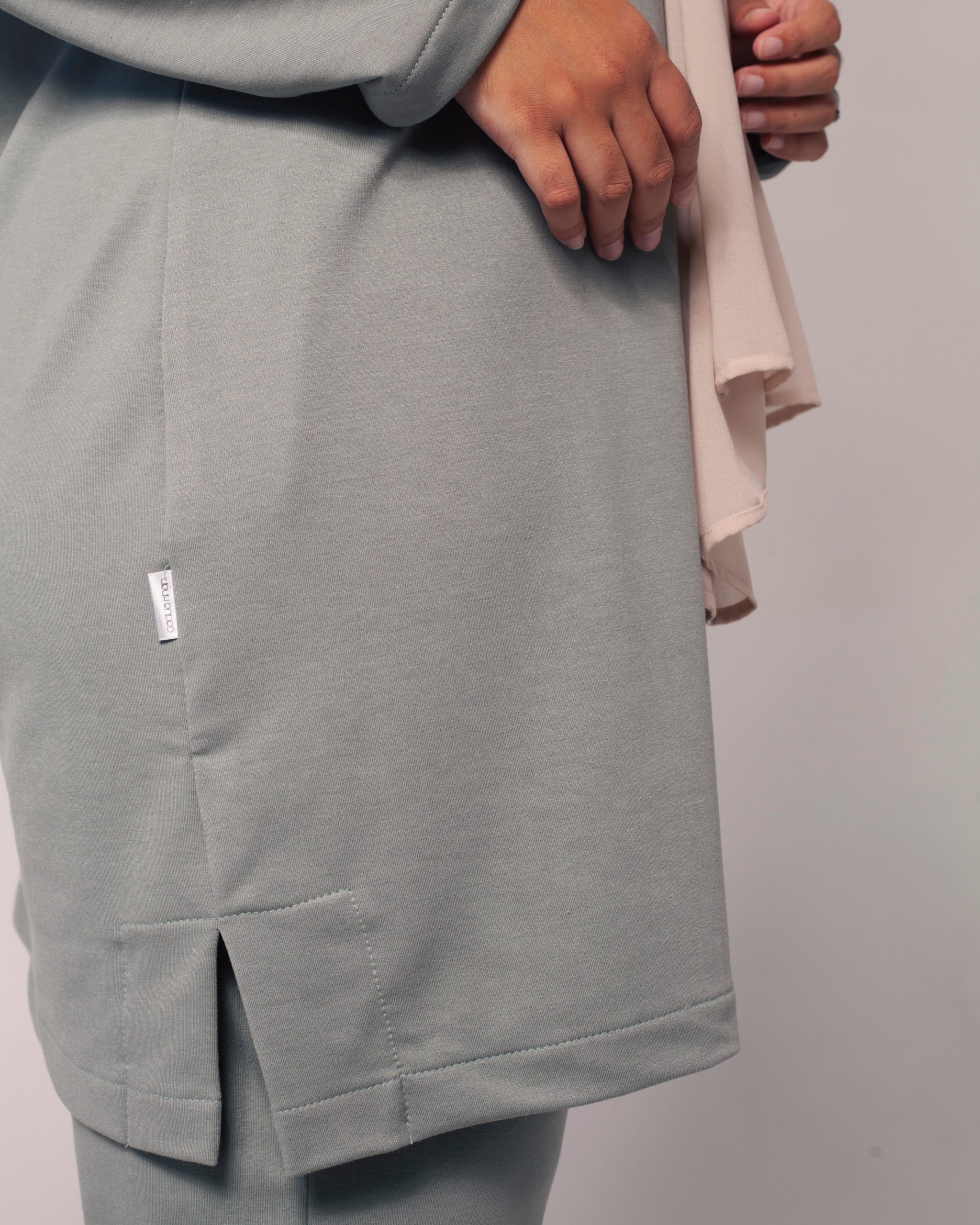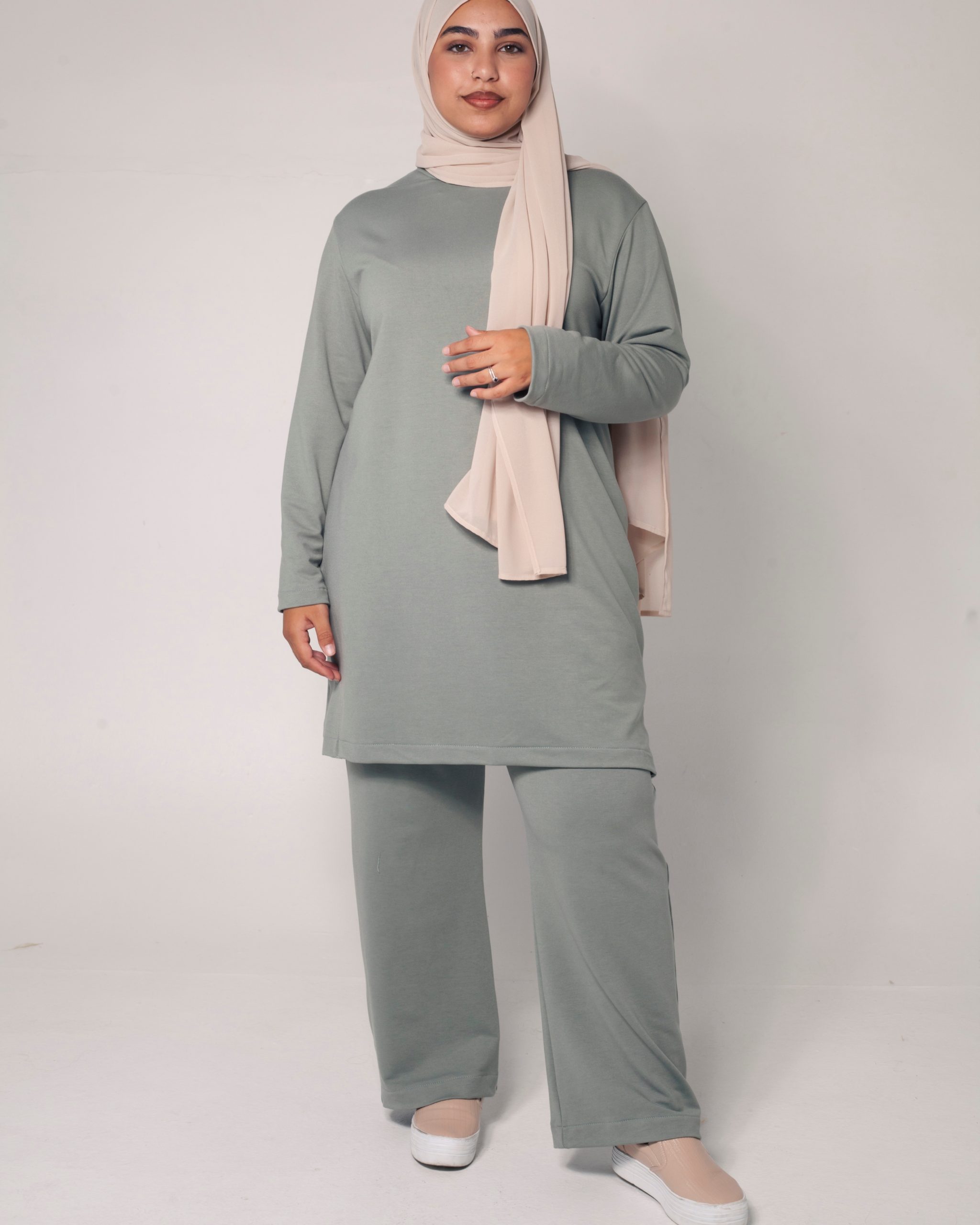 Full length sleeves, side pockets, back 5cm longer with side slits and a crew neckline.